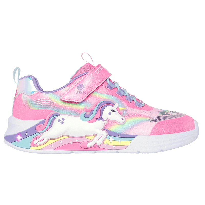 Brilla con estilo con las Skechers S-Lights® Unicorn Chaser. Este diseño deportivo iluminado de la Colección Magical® presenta una parte superior sintética con acabado brillante y un gráfico lateral de unicornio y arcoíris, cordones elásticos, correa ajustable en el empeine y una plantilla acolchada y cómoda.