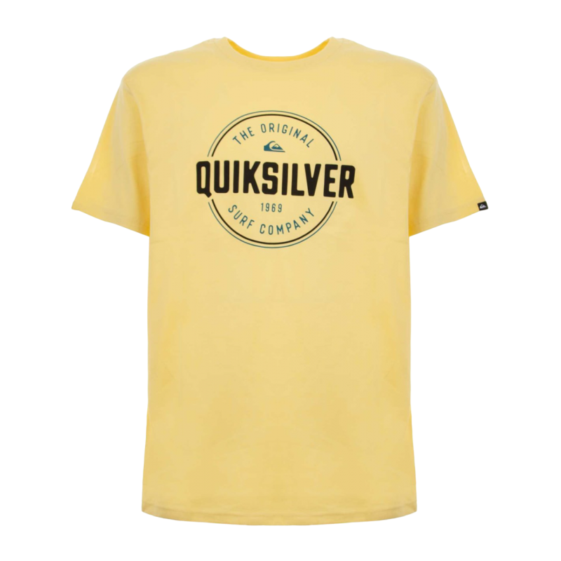Camiseta de manga corta en color amarillo para hombre de la marca Quiksilver. Es de ajuste holgado y tiene el cuello redondo de canalé. Luce un estampado de la marca en el pecho.