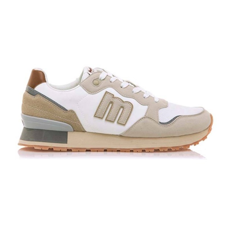 Zapatillas Joggo Classic blancas para hombre, marca Mustang. Estas zapatillas destacan por su contraste entre el blanco y el beige, ya que todos sus detalles y acabados, incluido el logotipo lateral, son de este color. La suela también presenta tonos grises.