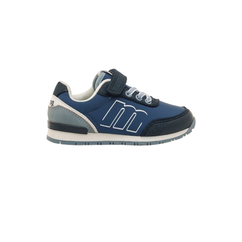 Zapatilla deportiva Joggo Mustang para niño, diseñada en una combinación de colores en azul marino, gris y blanco, cuenta con un cierre de tira adhesiva para una puesta más fácil. Logo de la marca bordado en el lateral de color blanco. Suela dentada para mayor comodidad. Un modelo Mustang ideal para su día a día.