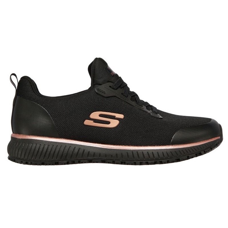 Skechers Squad SR 77222EC Black/Rose Gold. Zapatillas deportivas de trabajo, elaboradas en malla suave y tejido sintético, cordones elásticos en la parte delantera, suela con tracción antideslizante y plantilla Skechers Memory Foam™ con amortiguación.